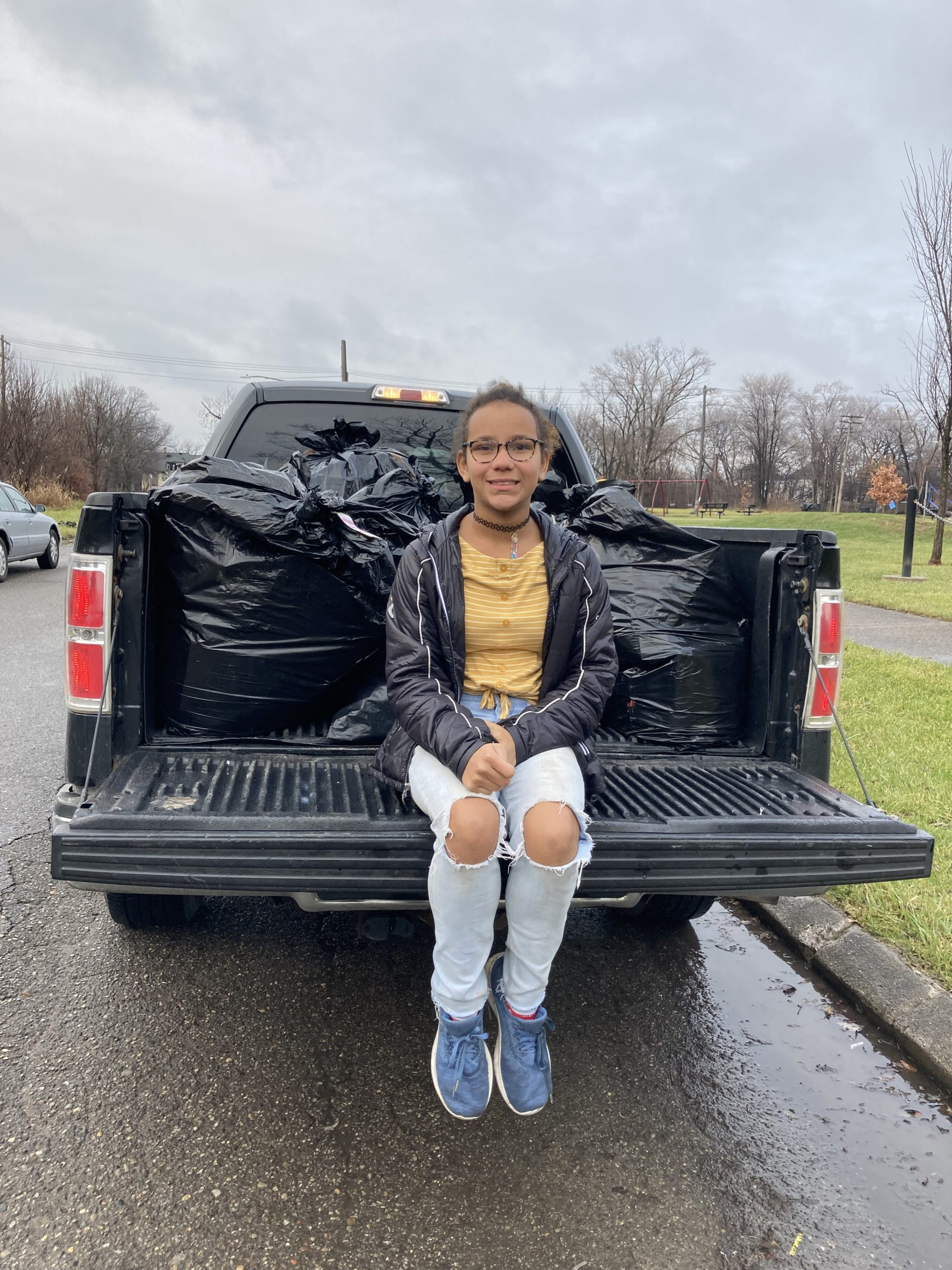 - One person sitting on the back of a pickup truck that holds bags of gifts provided by generous Gifts for All God’s Children donors
