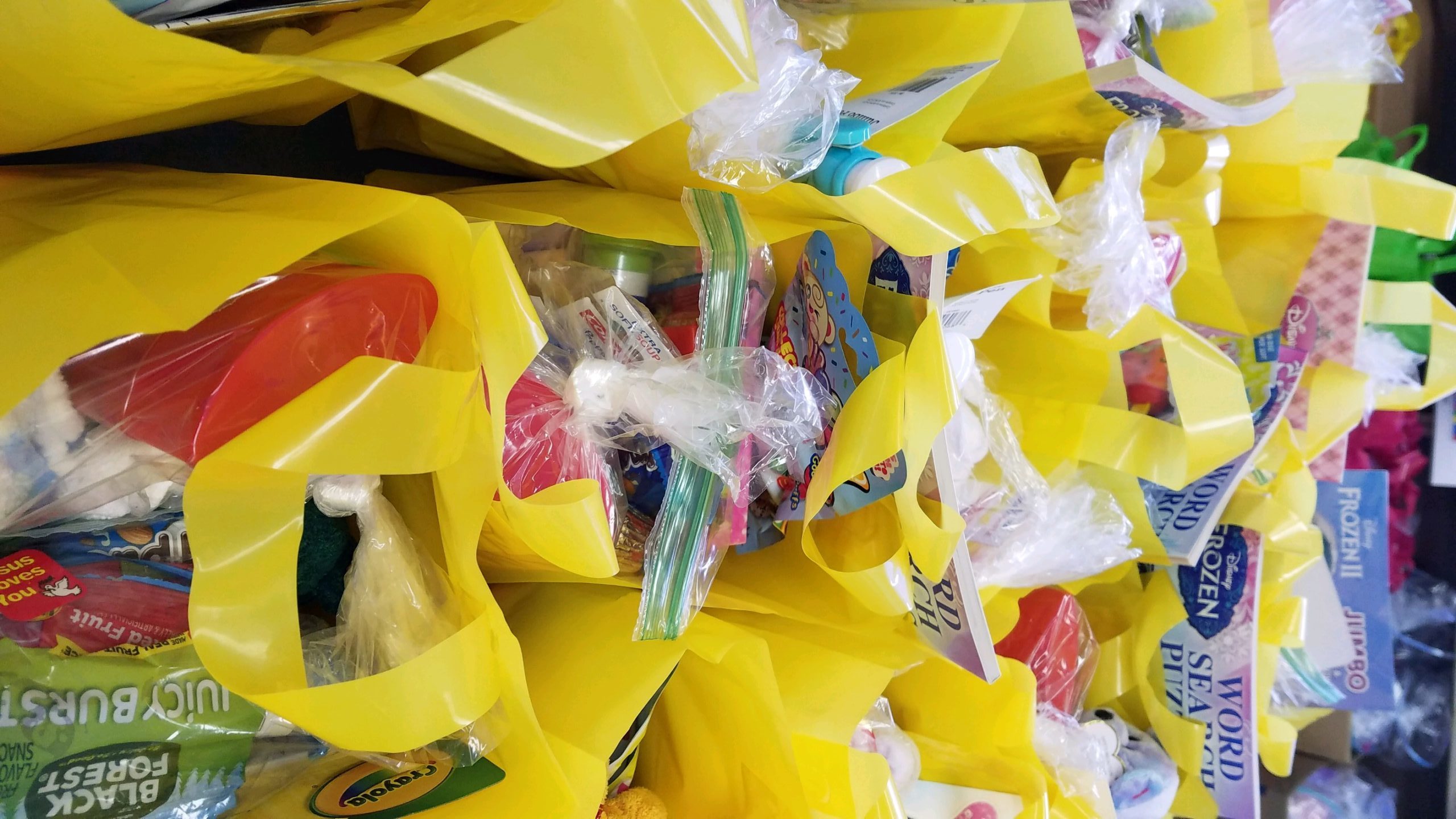 Thanks to Marsha Bauer and Karen McClelland and our supporters, we packaged 1,742 Easter baskets with candy, toys, hygiene kits, and spiritual messages that will let the recipients know that Jesus loves them and is there for them.